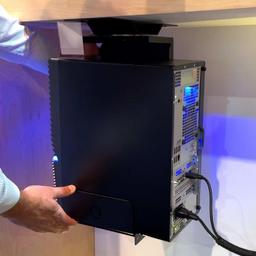 The Adjustable Under Desk PC Mount is a convenient solution for displaying Small Form Factor PCs and "Medium Sized" PCs under your desk.