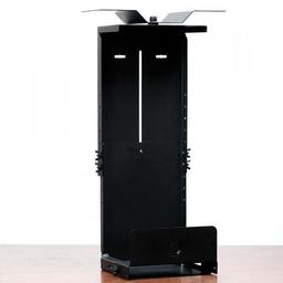 Adjustable in every way, this mount can extend horizontally and vertically to fit a variety of different size towers. It adjusts to hold PC sizes of 9.75"- 18" in height, a maximum of 16" in-depth, and 7.5" in width. Check out the specification sheet for a visual representation. Its top-mounted feature is perfect for sit/stand desks to get a tower off the floor or desktop. Made of cold-rolled steel finished in a black powder coat, the mount has a carrying capacity of 40 Lbs. Additionally, its 360-degree swivel feature allows for easy access between cords, buttons, and switches.